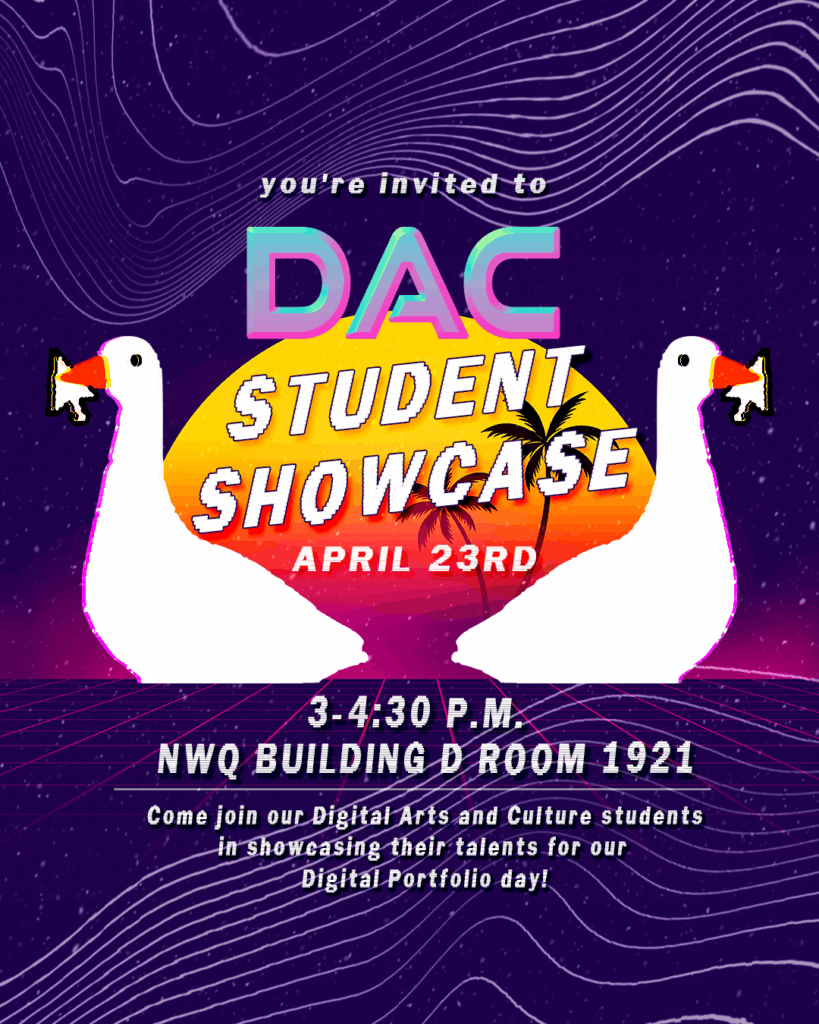 Throughout the course, I engaged in conversation with fellow Digital Arts & Culture students while we discussed different media and art forms. These discussions culminated in a portfolio showcase that happened at the end of the semester.